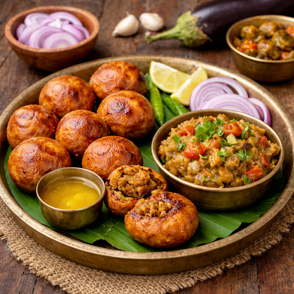 Crispy fried litti stuffed with spiced sattu, served with smoky baingan and aloo chokha